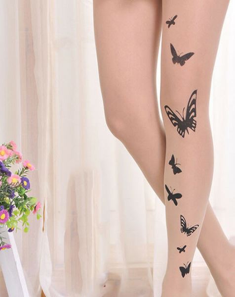 גרביון נשים שקוף עם הדפס פרפרים לאורך רגל אחת.