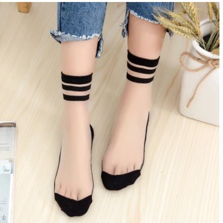 גרביים שקופים ודקים עם סיומת פסים שחורים.