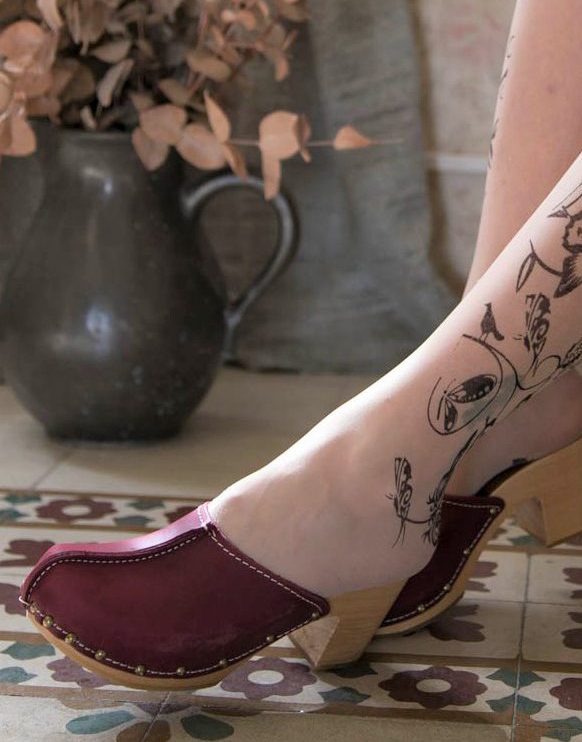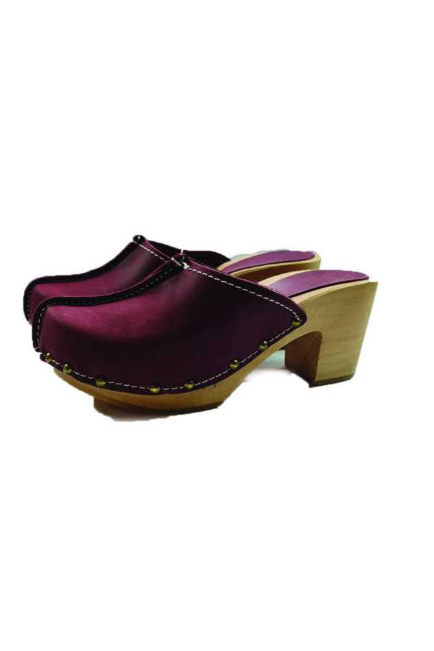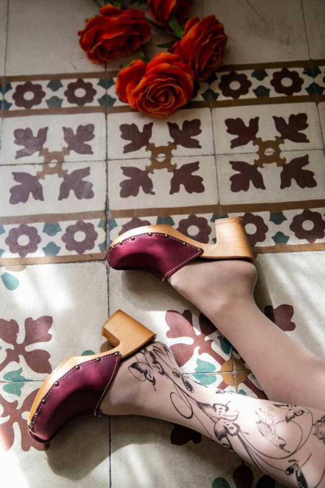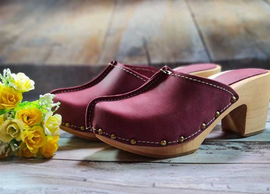 קבקבי עץ וינטג' עם עקב רחב וגבוה גפת עור ייחודית בצבע בורדו מדהים בשילוב