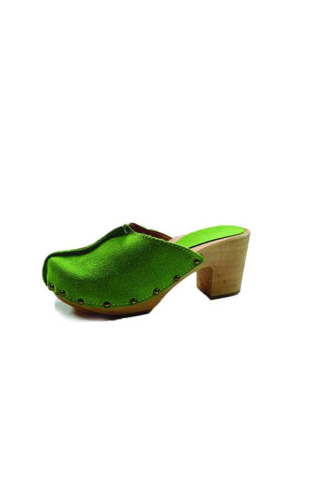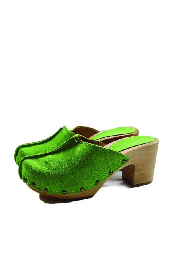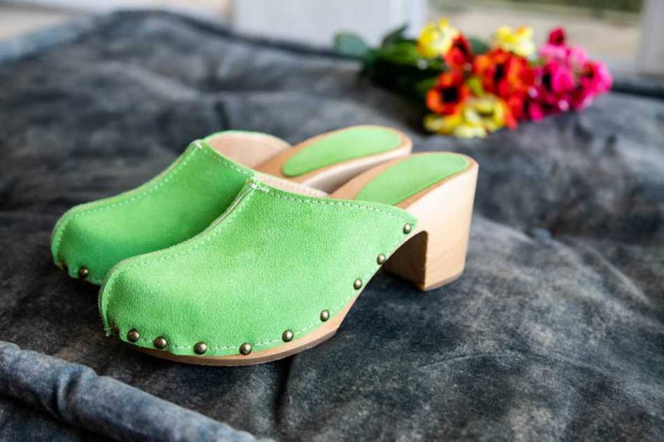 קבקבי עץ וינטג' עם עקב רחב וגבוה גפת עור הפוך ייחודית בצבע ירוק בהיר מהמם בשילוב ניטים.