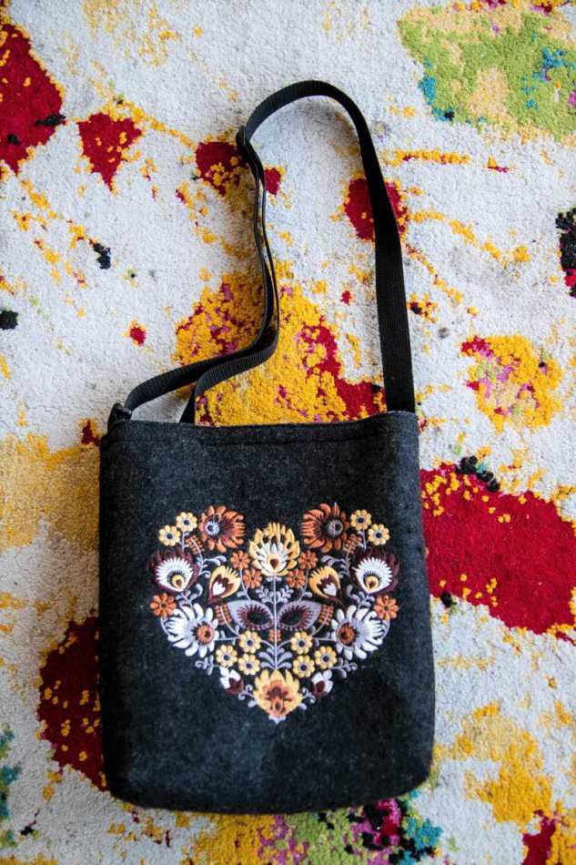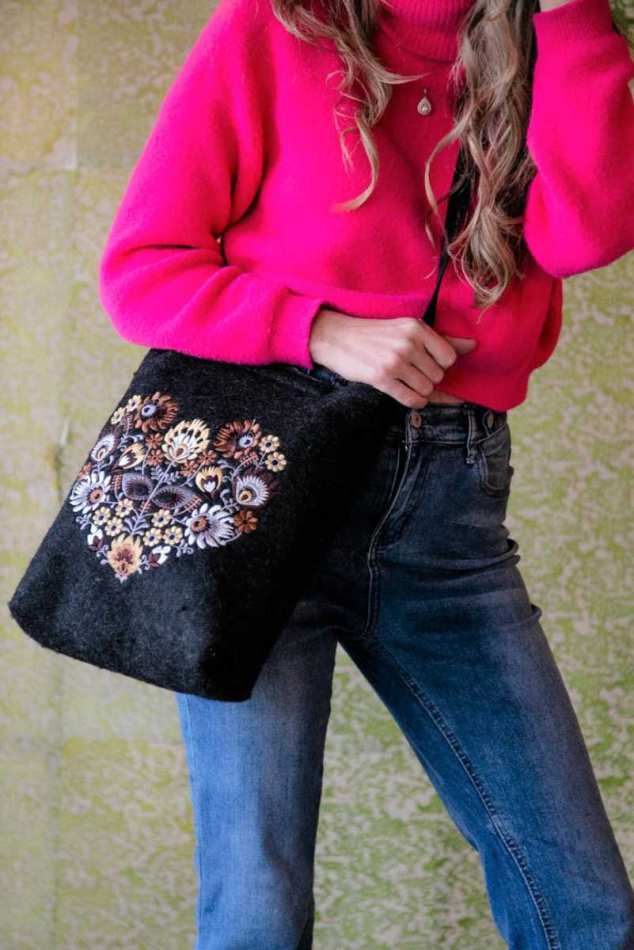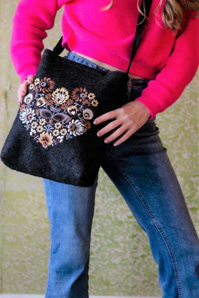 התיק מעוטר ברקמת פרחים מהממת בגווני צהוב וחום.