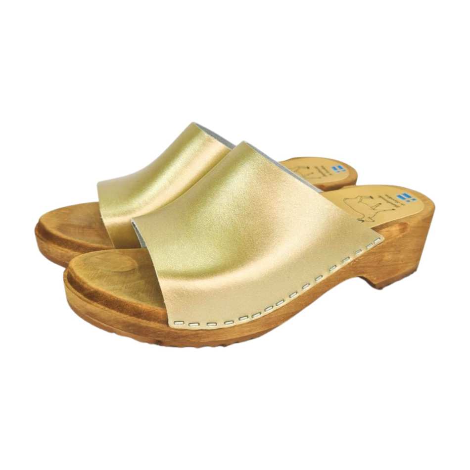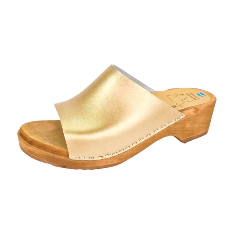 גפת עור מהממת בצבע שמפניה אלגנטית ועדינה. סוליית עץ ארגונומית קלה ונוחה