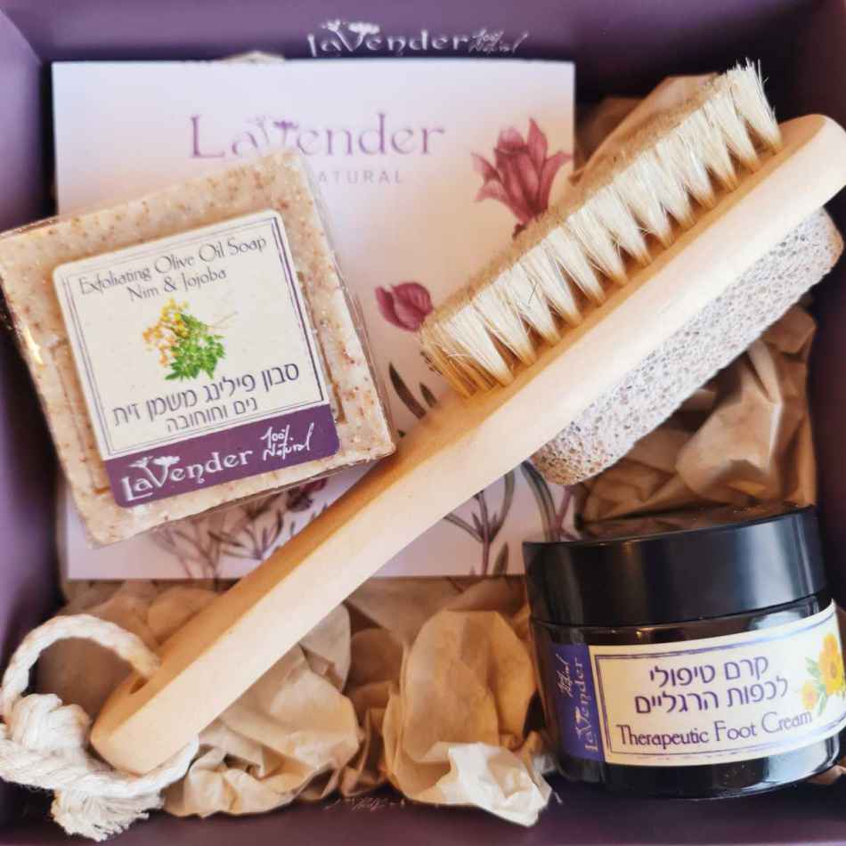 מארז הכולל קרם משקם לכפות הרגליים ןסבון טבעי.