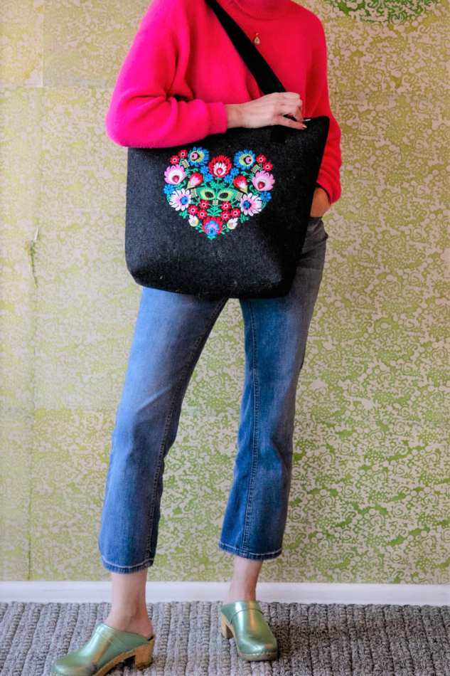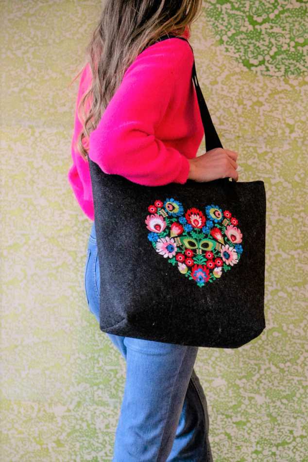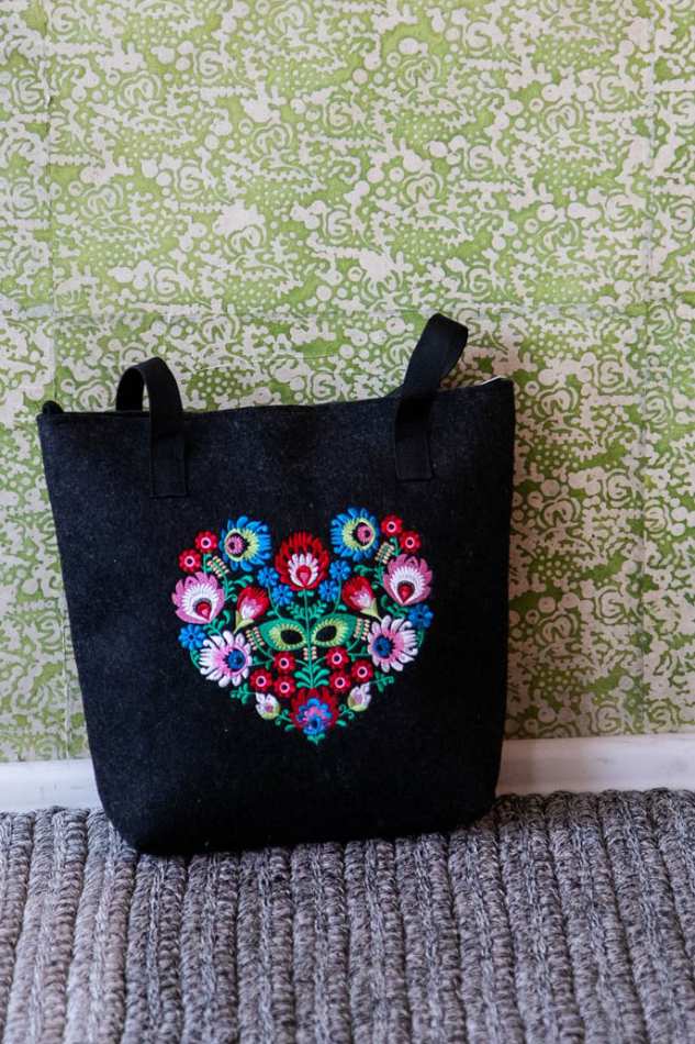התיק מעוטר ברקמת פרחים מהממת בירוק וכחול.
