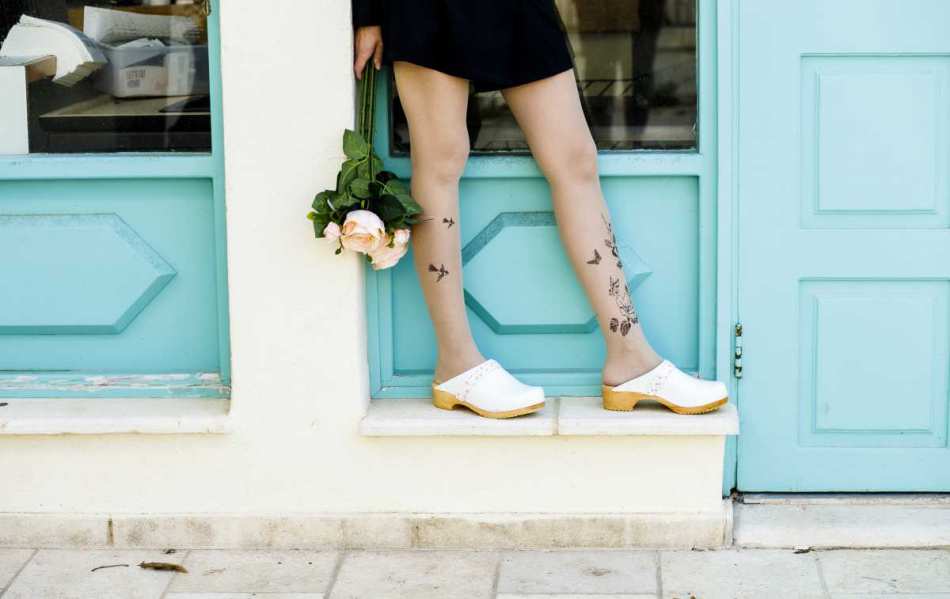 קבקבי עץ אורתופדיים משבדיה בצבע לבן עם רצועת פרחים עדינה.